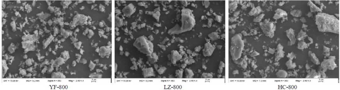 上圖放大倍數為2000 倍。從圖中可以看出,三種碳酸鈣粒子均呈無規形狀,其中采用大方解生產的YF-800 顆粒表面孔和凹陷較多點,結晶度更完整,顆粒表面沒有附著太多小顆粒;而其他兩種礦石加工的粉體其表面都附著了一定的小顆粒,有些成為了一些小的團聚體。從粒子分布的均勻度上看,YF-800 的粒子分布的更均勻,顆粒的大小基本一致,而其他兩種碳酸鈣顆粒大小差異程度比較大,粒子分布相對不均勻一些。